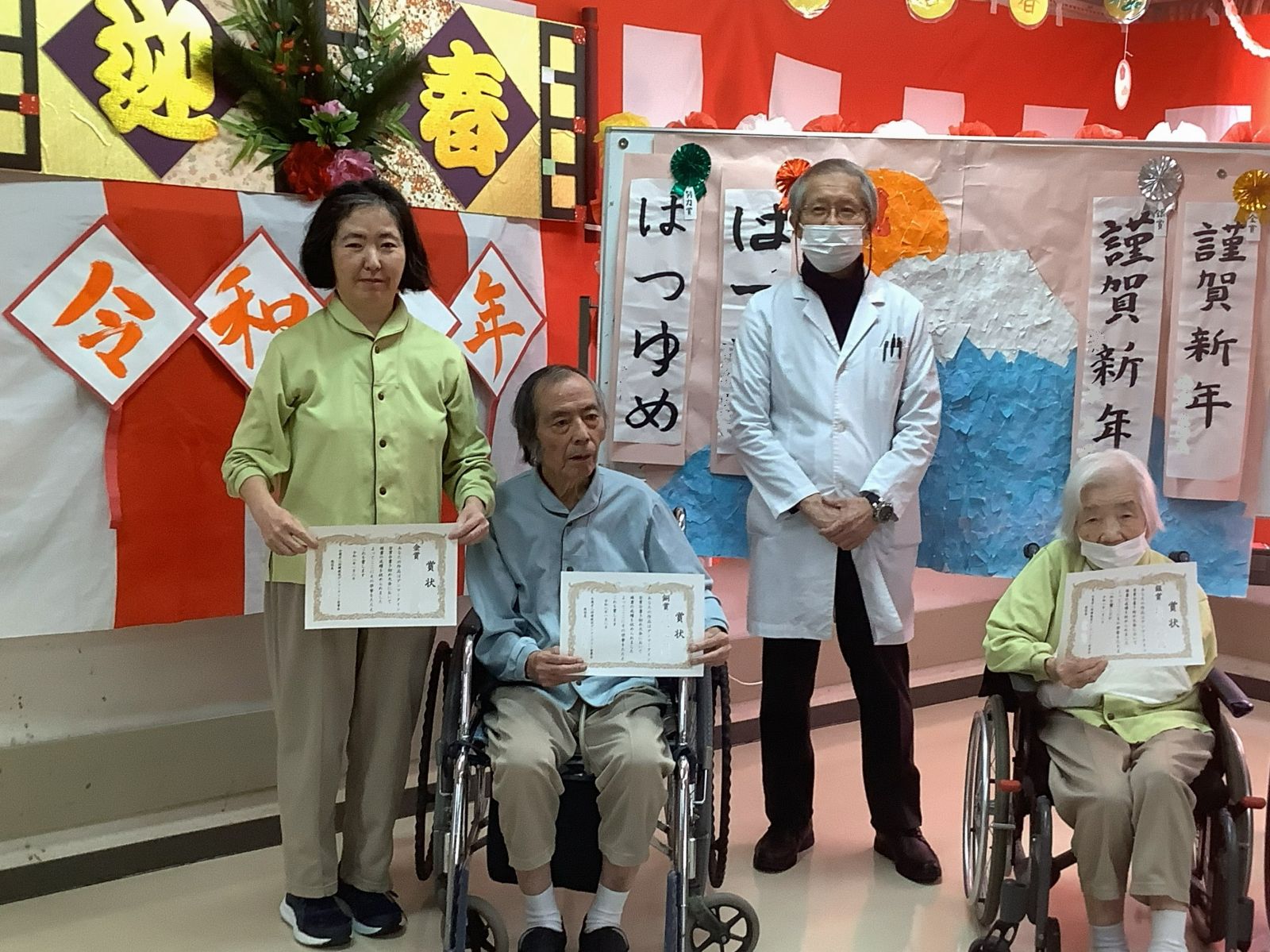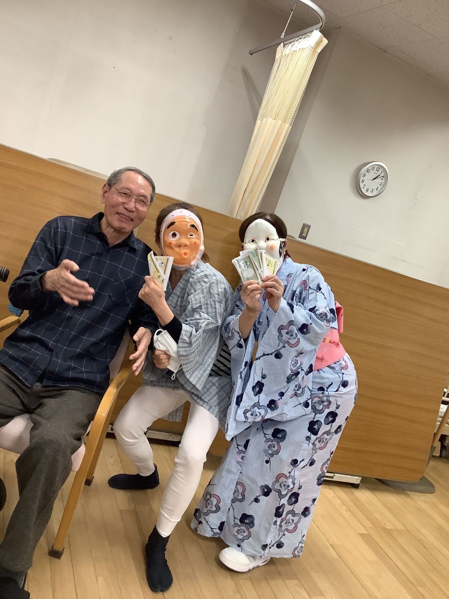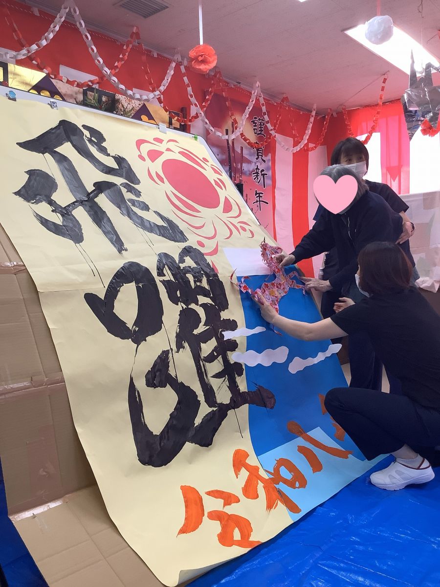 毎年行われている書初めの表彰や獅子舞、おかめ・ひょっとこの練り歩きをはじめとし、各フロアで考えたプログラムをお楽しみ頂きました。お正月らしい福笑いや風船羽子板、二人羽織、初詣等、各フロアで利用者様の笑顔を多く見る事ができました。